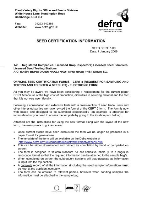 Official Seed Certification Forms Cert 5 Defra
