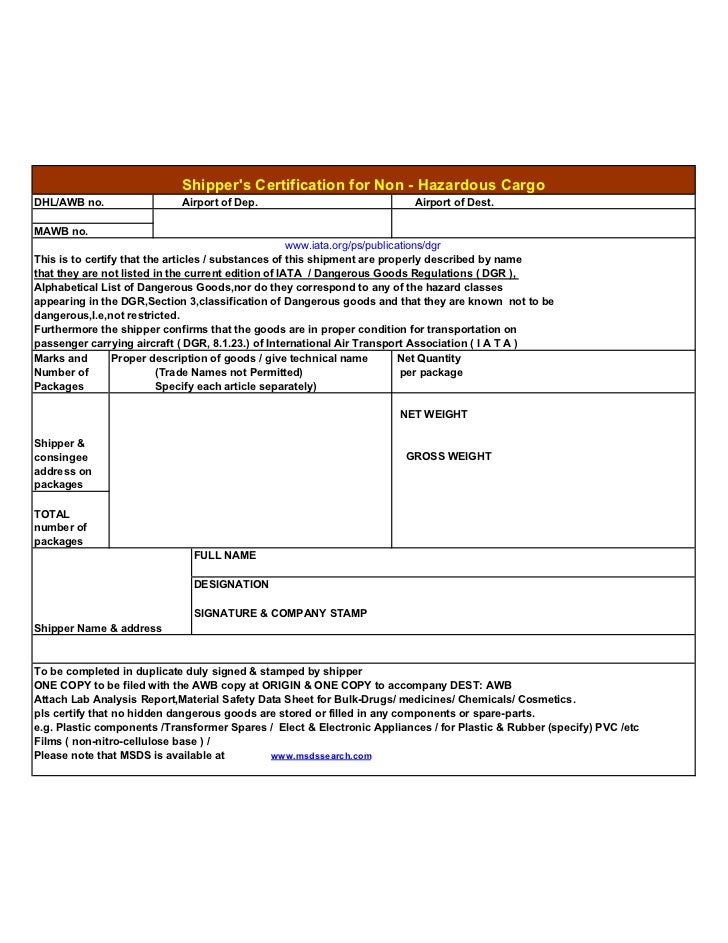 Dangerous Goods Declaration Shipping Freight Form The Usa