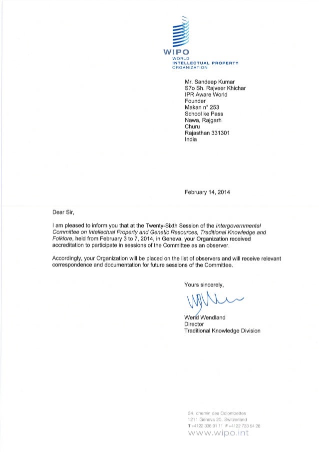 Wipo Letter For Confirming Ipr Aware World As An
