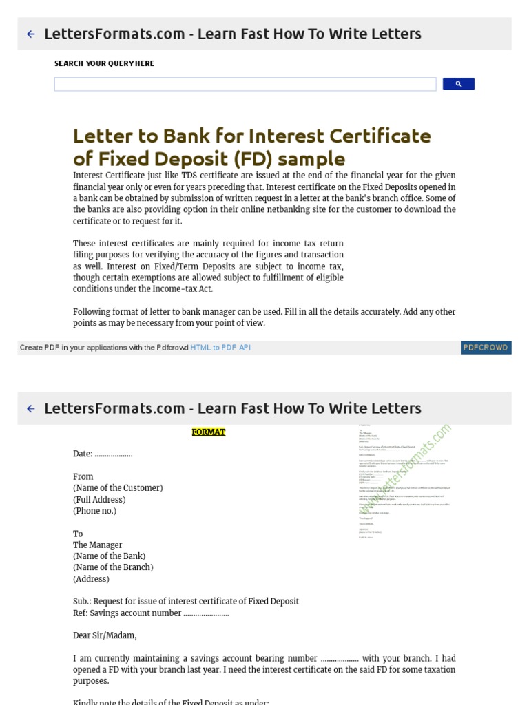 Letter To Bank For Interest Certificate Of The Fixed Deposit