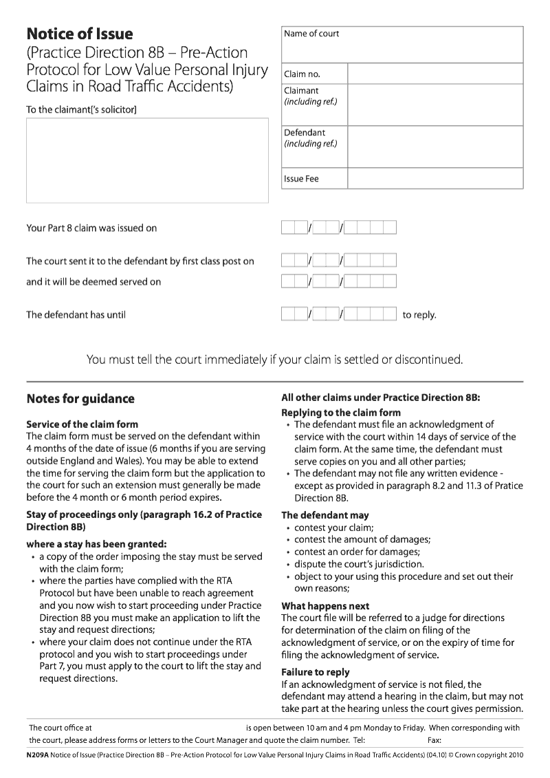 N209a Notice Of Issue Practice Direction 8b Pre Action