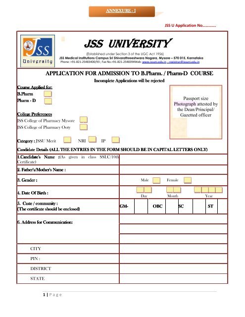 B Pharm Pharm D Application Form Jss University Mysore