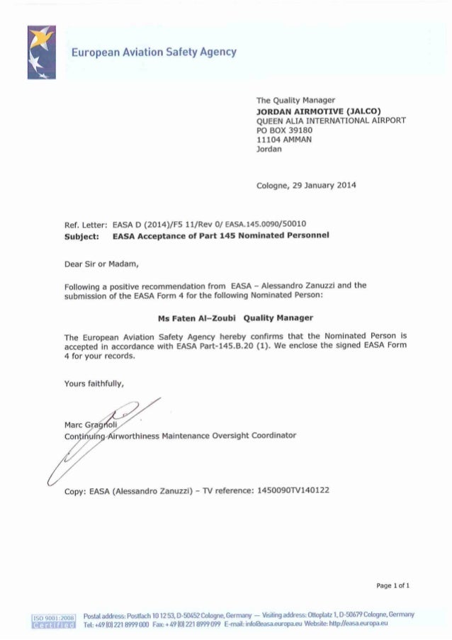 Easa Acceptance Letter For Qa Manager Position