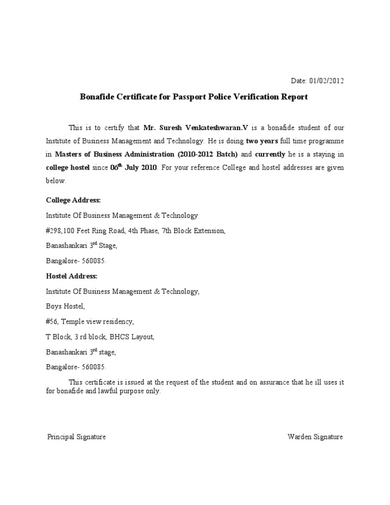 College Bonafide Certificate For Passport 1701