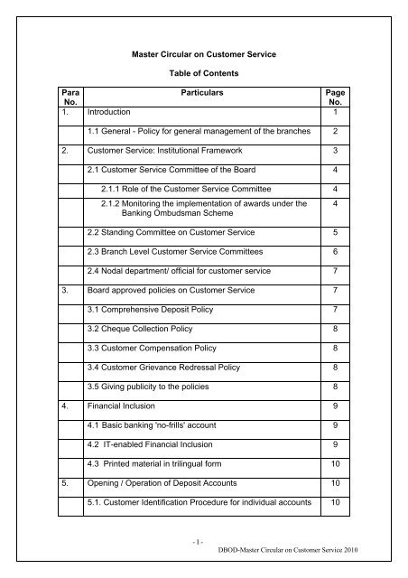 Master Circular On Customer Service Table Of Contents