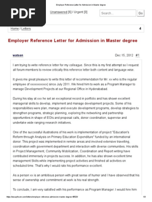 Employer Reference Letter For Admission In Master Degree