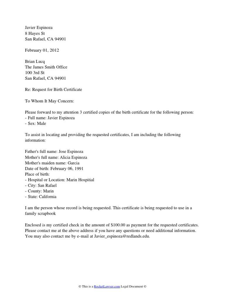 Sample Letter For Birth Certificate Request Sample