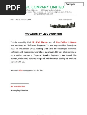 To Whomsoever It May Concern Experience Certificate Format