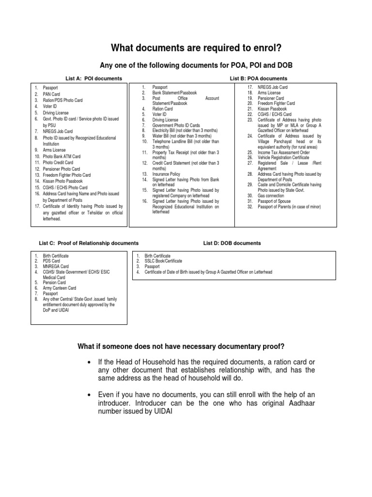 Uidai Full List Of Documents Required For Getting Aadhaar