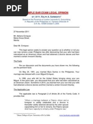 Sample Legal Opinion By Atty Ralph Sarmiento Divorce