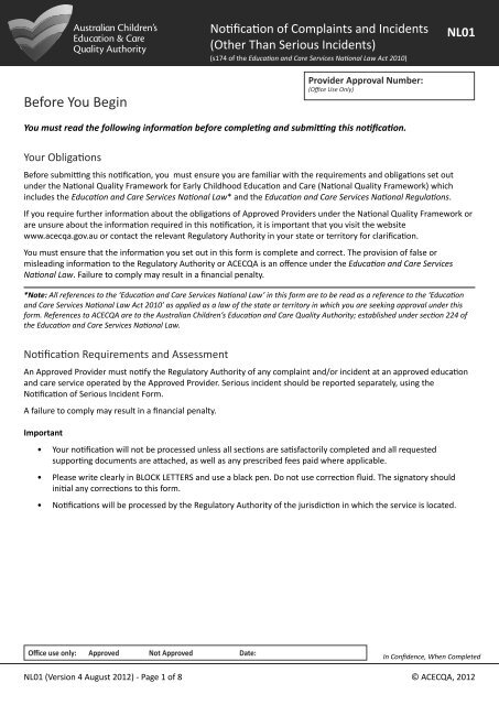 Nl01 Notification Of Complaints And Incidents Acecqa