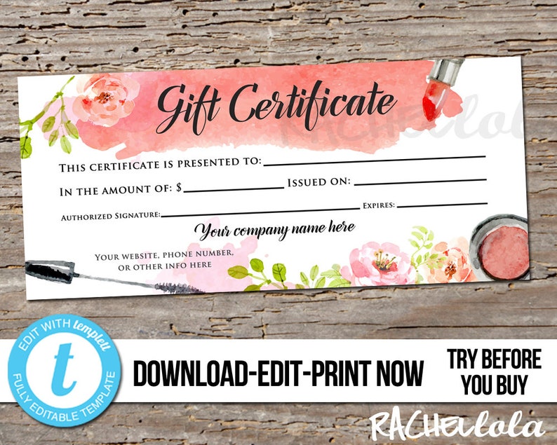 Editable Custom Makeup Gift Certificate Printable Template Hair Salon Voucher Mary Kay Avon Stylist Digital Instant Download Templett