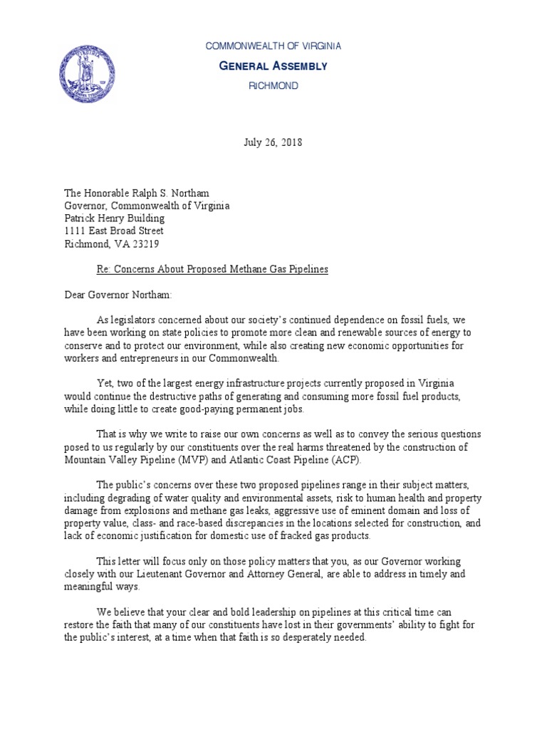 Legislators Letter To Gov Northam On Pipelines July 26 2018