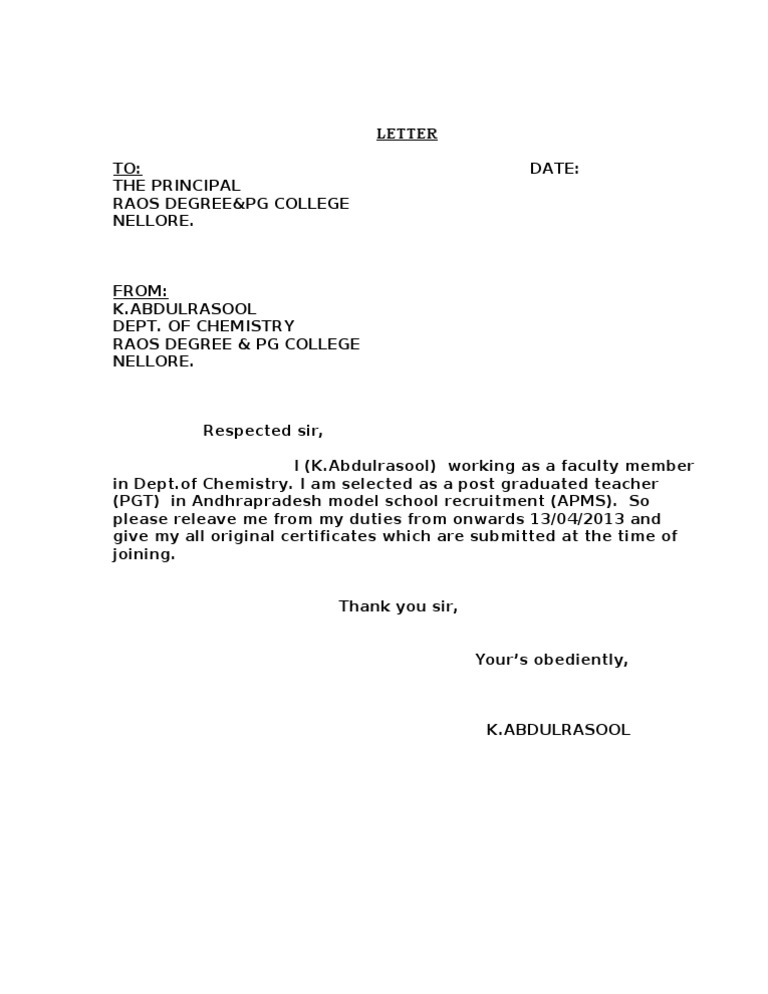 Sample Format Of Letter To Principal For Getting Original Certificates