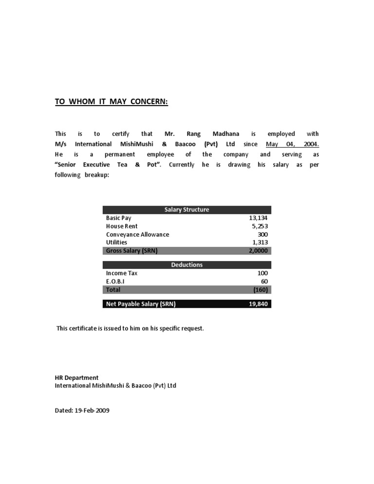 Format Of Salary Certificate And Sample Salary Certificate