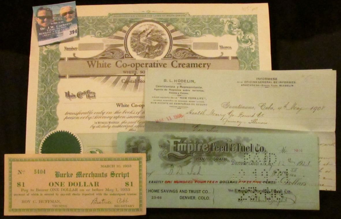 Certificate For Shares Of The Capital Stock White Co Operative Creamery White S D 1908 Letter O