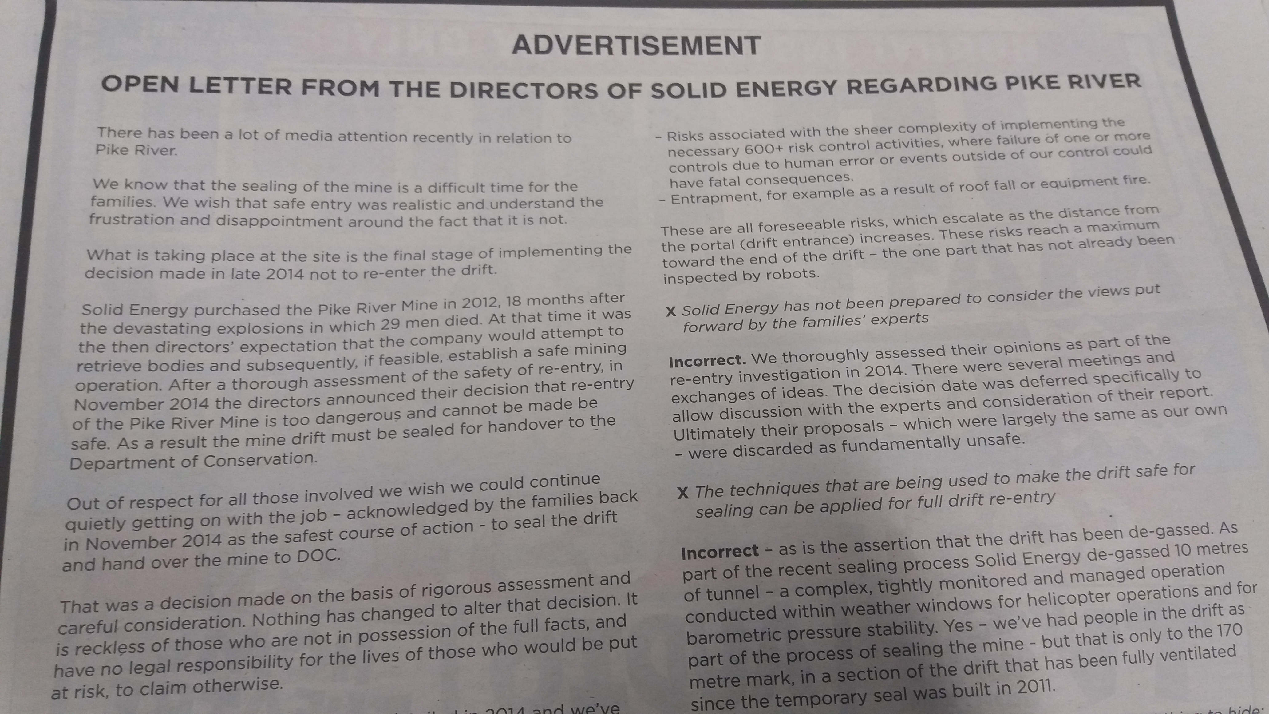 Solid Energy Hit Out At Pike Protests With Full Page Ad