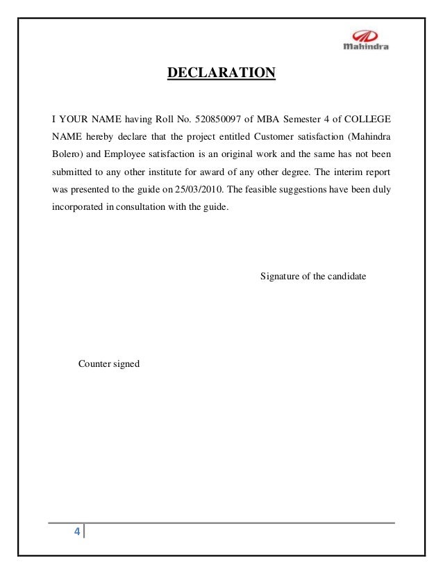 Declaration Format For Project Report