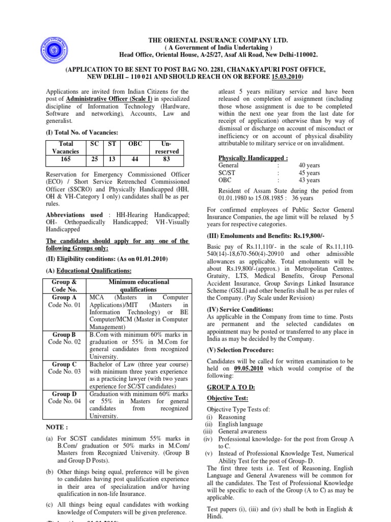 The Oriental Insurance Company Ltd Recruitment Of Ao 2010