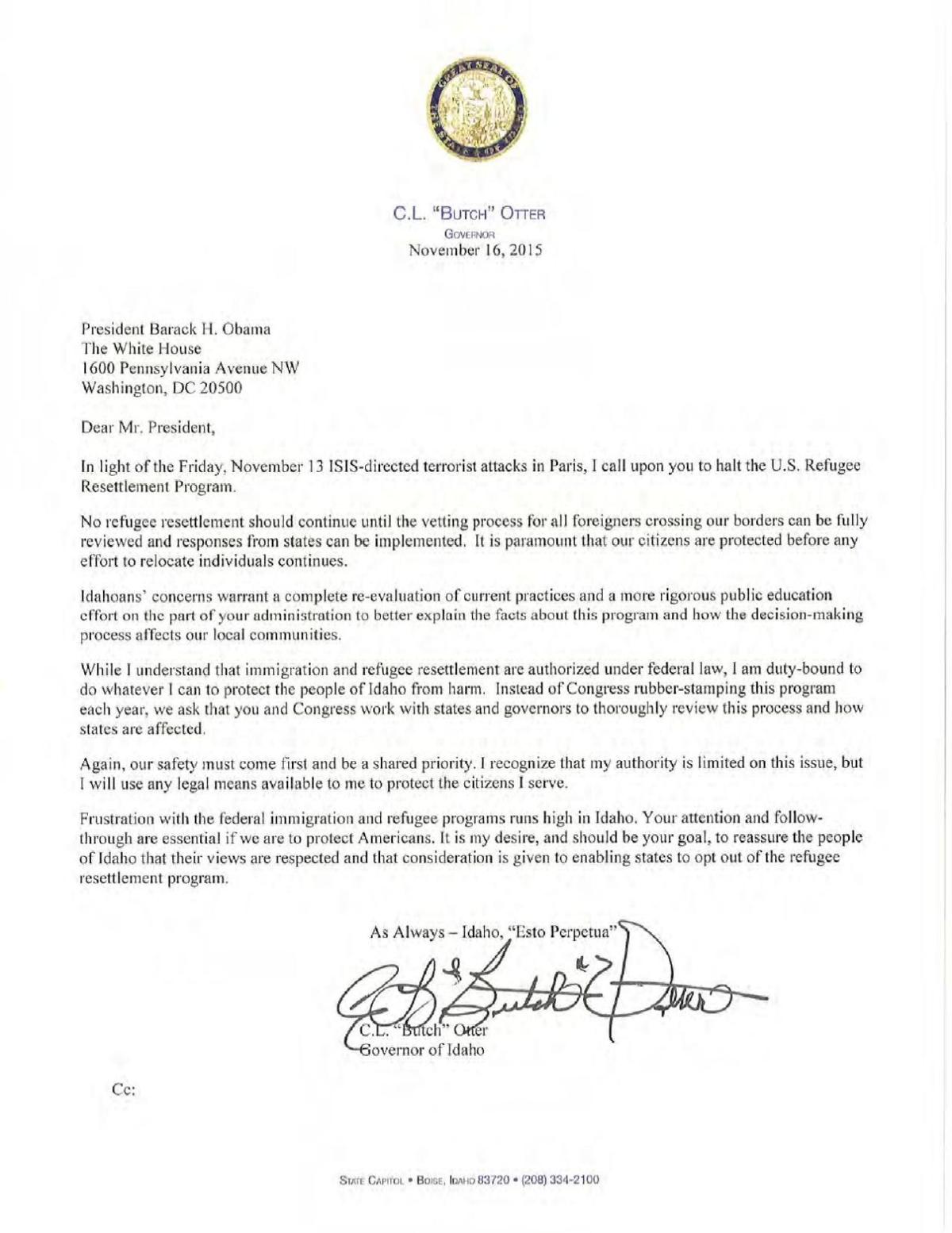 Otter Letter To Obama On Refugee Resettlement