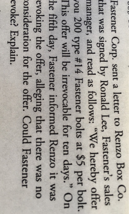 Solved Fastener Corp Sent A Letter To Renzo Box Co That