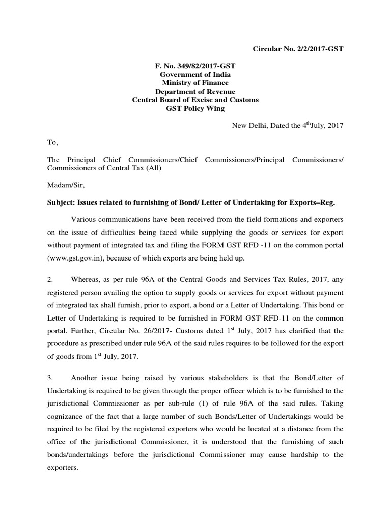 Circular No 4 4 2017 Gst Issues Related To Bond Letter