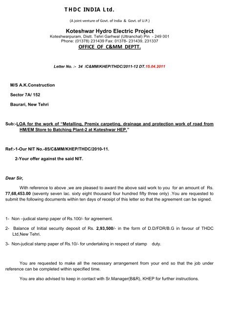 Thdc India Ltd Koteshwar Hydro Electric Project Office Of